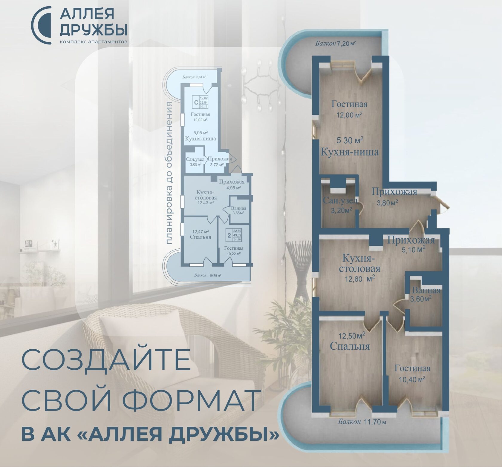 В АК «Аллея Дружбы» планировка не ограничивает Ваши идеи. Вы можете объединять апартаменты между собой и создавать пространство, которое идеально подойдет Вам.